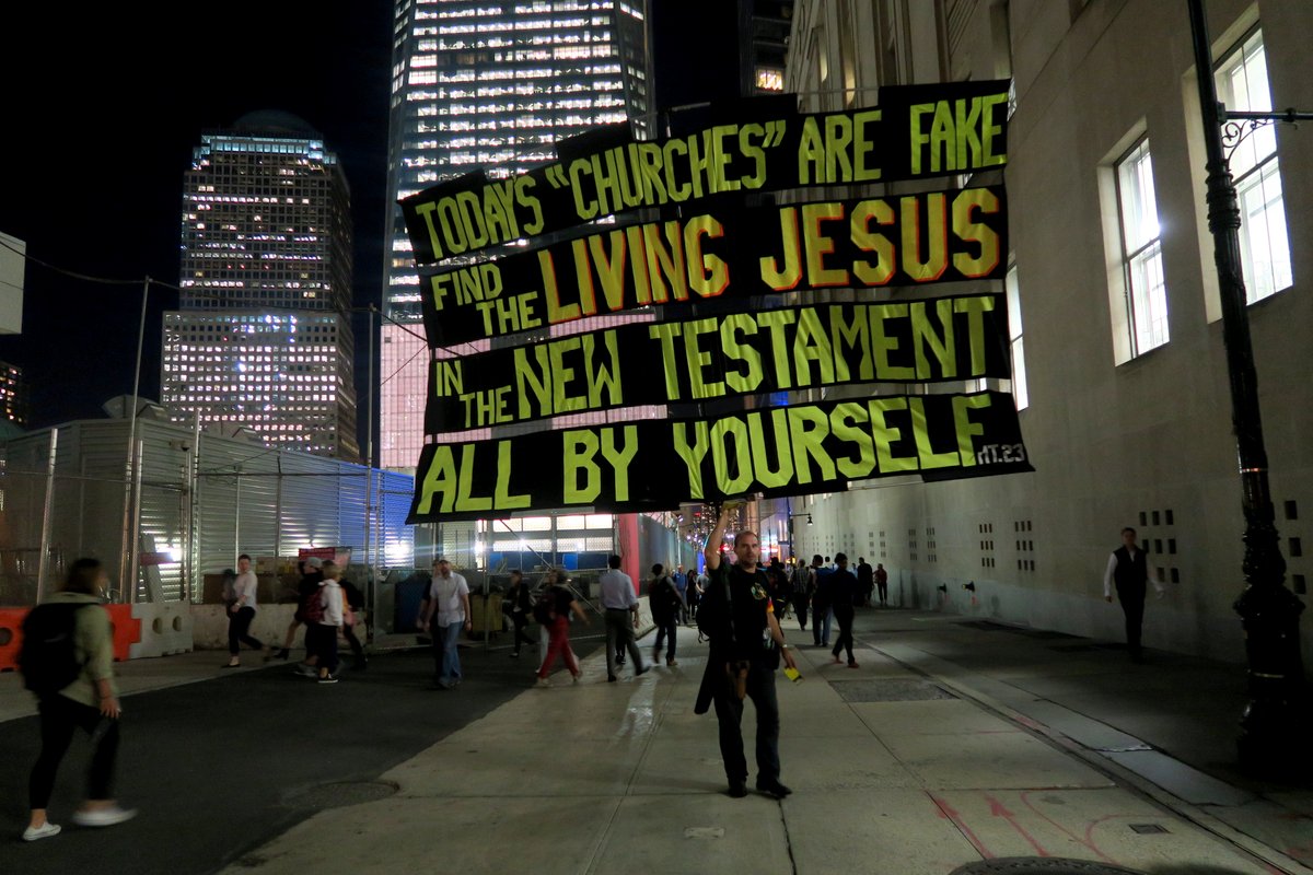 Выйдя на улицу тут же встречаем одного из сугубо Нью Йоркских персонажей: мужик с огромной вывеской, закреплённой на специальный рюкзак. "Сегодняшние церкви - подделка. Найтиде живого Иисуса!" Не совсем понятно, что мужик предлагает, зачем стоит.