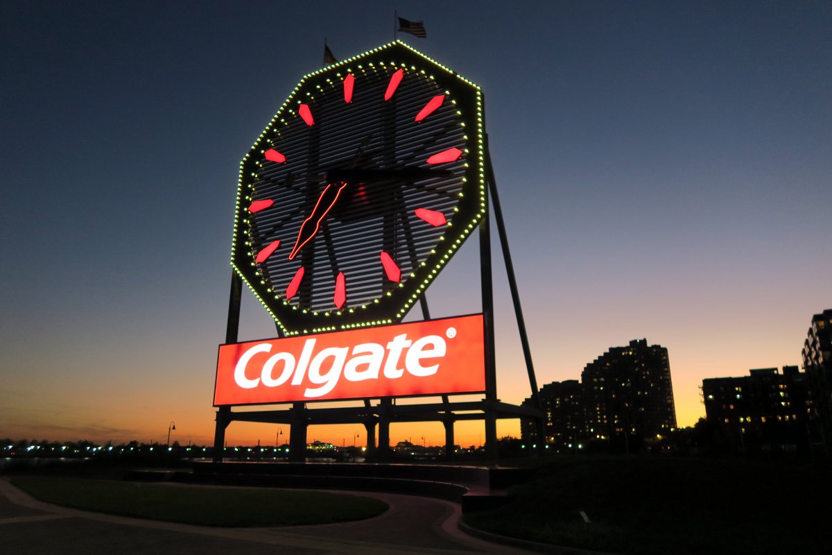 А вот эти часы мы много раз видели с Манхэттенского west side. Наконец можно поближе на них посмотреть. Сегодня одна из стрелок не работает. Оказывается они рекламируют зубную пасту. Раньше мне зрения не хватало это разглядеть.