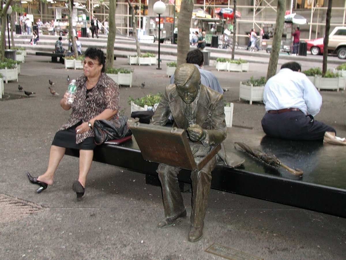 Скульптура Double Check (Перепроверка) была создана художником Джоном Джонсоном в 1982 году. Мужчина в костюме офисного работника сидел на скамейке в скверике перед башнями-близнецами - я хорошо его помню, он был сделан в человеческий рост, и краем глаза всегда казался настоящим.