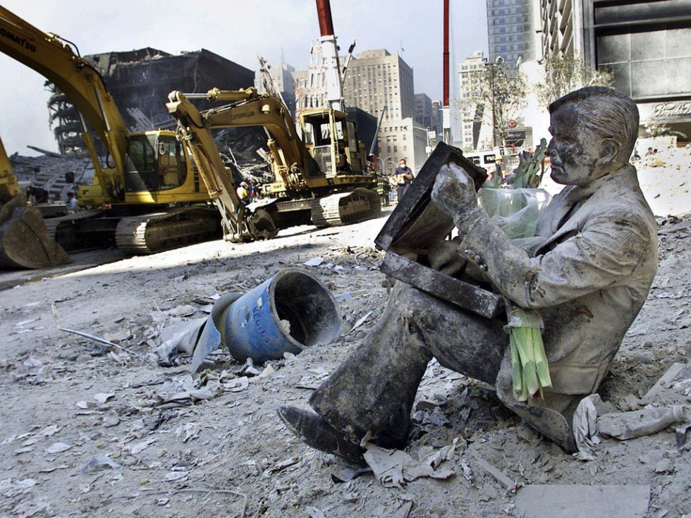 Когда близнецы обрушились, спасатели вытащили скульптуту из под обломков. Её снесло с креплений, но при этом она не пострадала. Говорят, изначально работающие там службы приняли мужчину за потерпевшего.