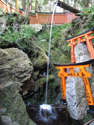 Ущелье было узким и загибалось влево, по его дну шла дощатая тропинка а в самом конце слышалось журчание текущей воды. Всюду вокруг, нас окружали оранжевые ворота храма лисьей богини Инари.