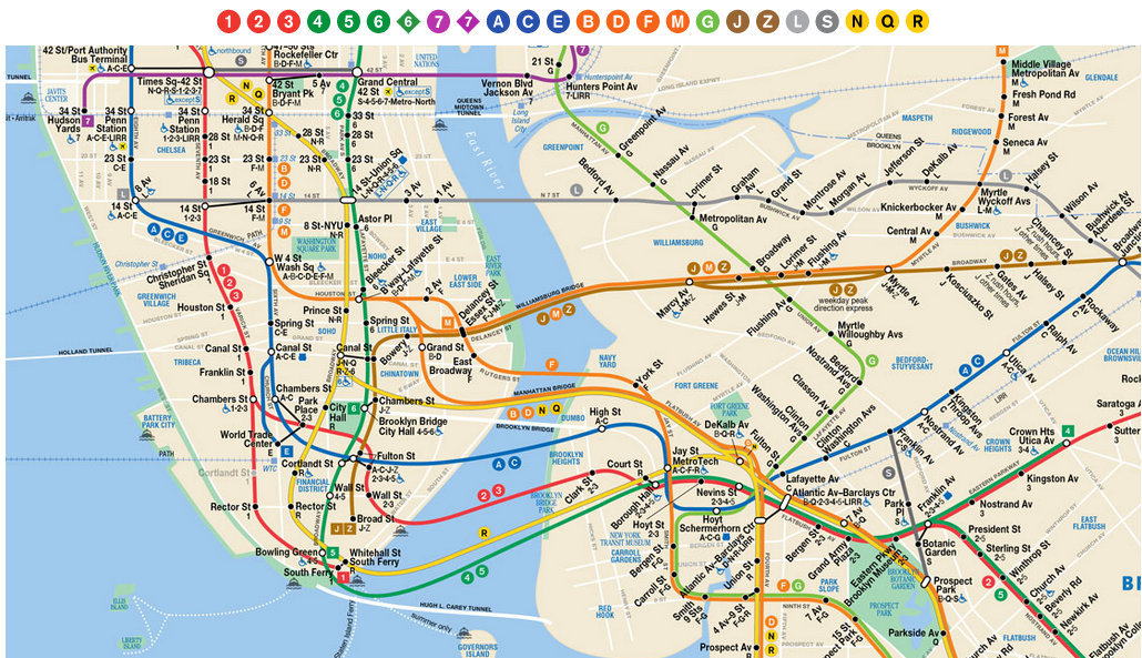 Приезжие в Нью Йорк часто путаются в нашем метро. Всё потому, что нью-йоркском метро аж 22 линии сервиса, и по несколько линий обозначены одинаковым цветом.