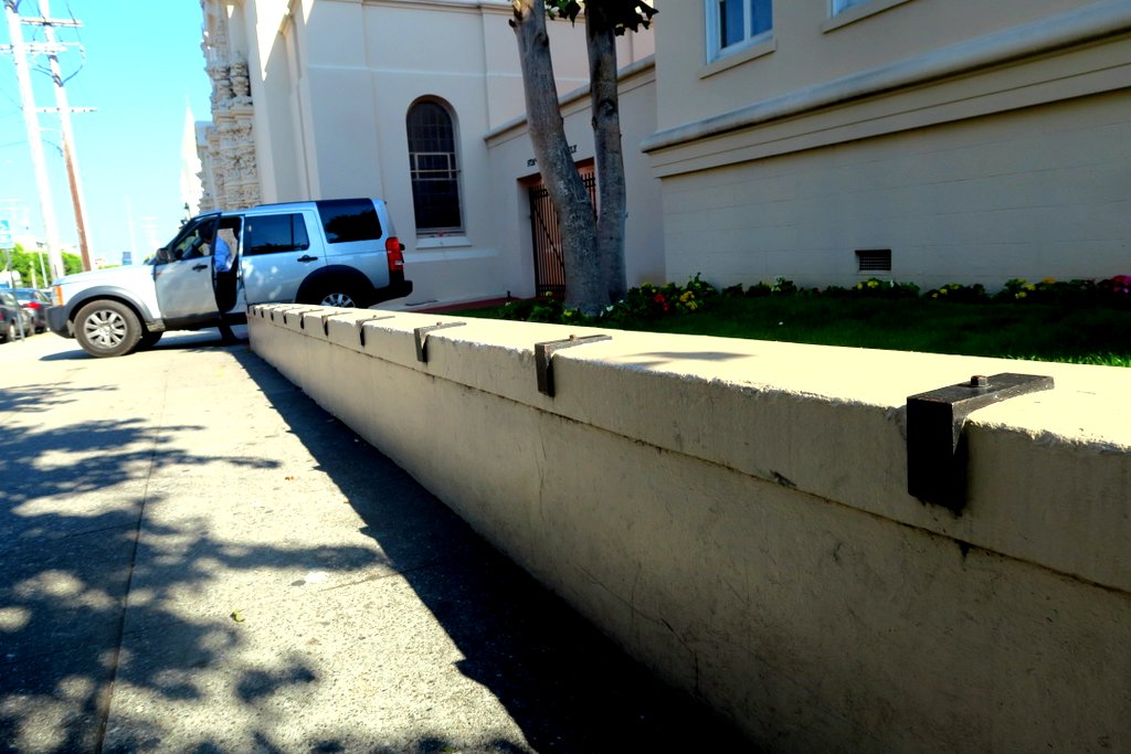 Посмотрите на эти железные скобки приделанные к низкой стенке под одним из общественных зданий СФ. Как вы думаете для чего они туда присобачены?