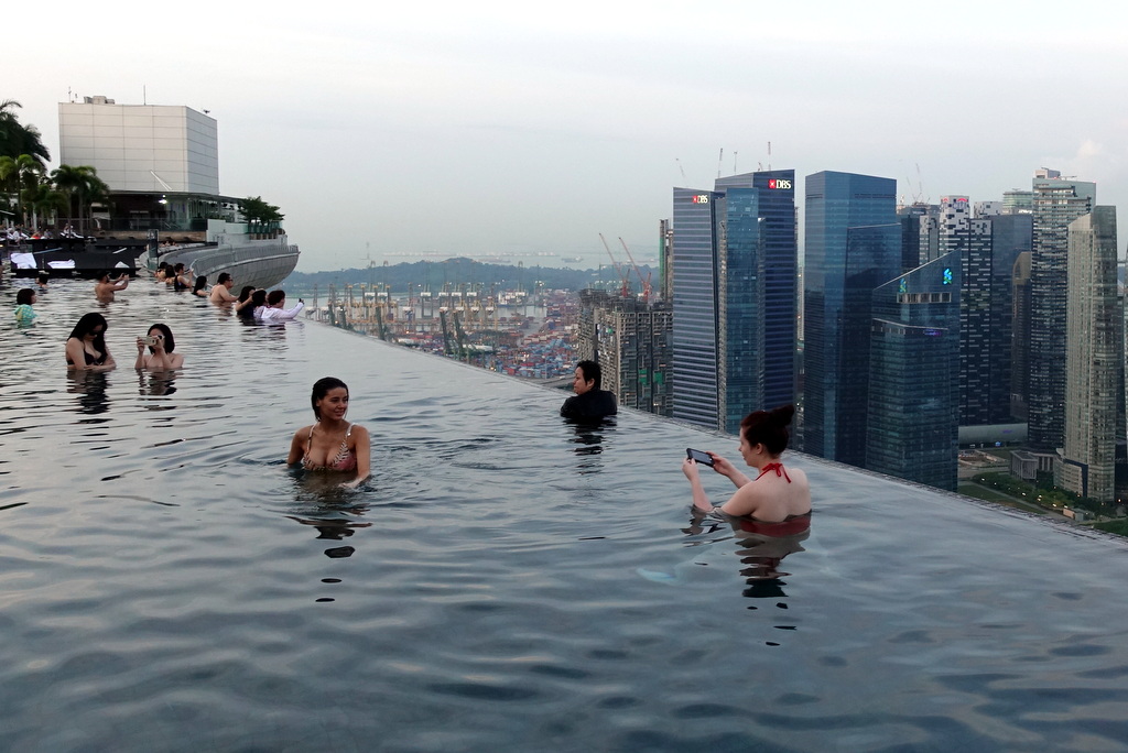Говорить о чём-то, особенно о бассейне, что он самый известный в мире - история ненужно пафосная. Известность - понятие субъективное. Это ж не башня, которую можно в высоту измерить, и сказать - да, она выше всех. Но уж если выбирать один бассейн на такое звание, то несомненно вот именно он, на крыше комплекса Marina Bay Sands в Сингапуре.