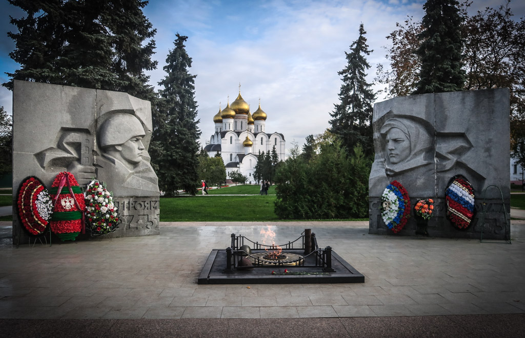 В прошлом году я на один день заезжал в Ярославль, навестить родственников. Гуляя по городу мы набрели на мемориал героям Великой Отечественной Войны. Всё сделано по канонам жанра - героические, суровые лица в гранитных блоках, высеченные годы, вечный огонь, венки цветов...