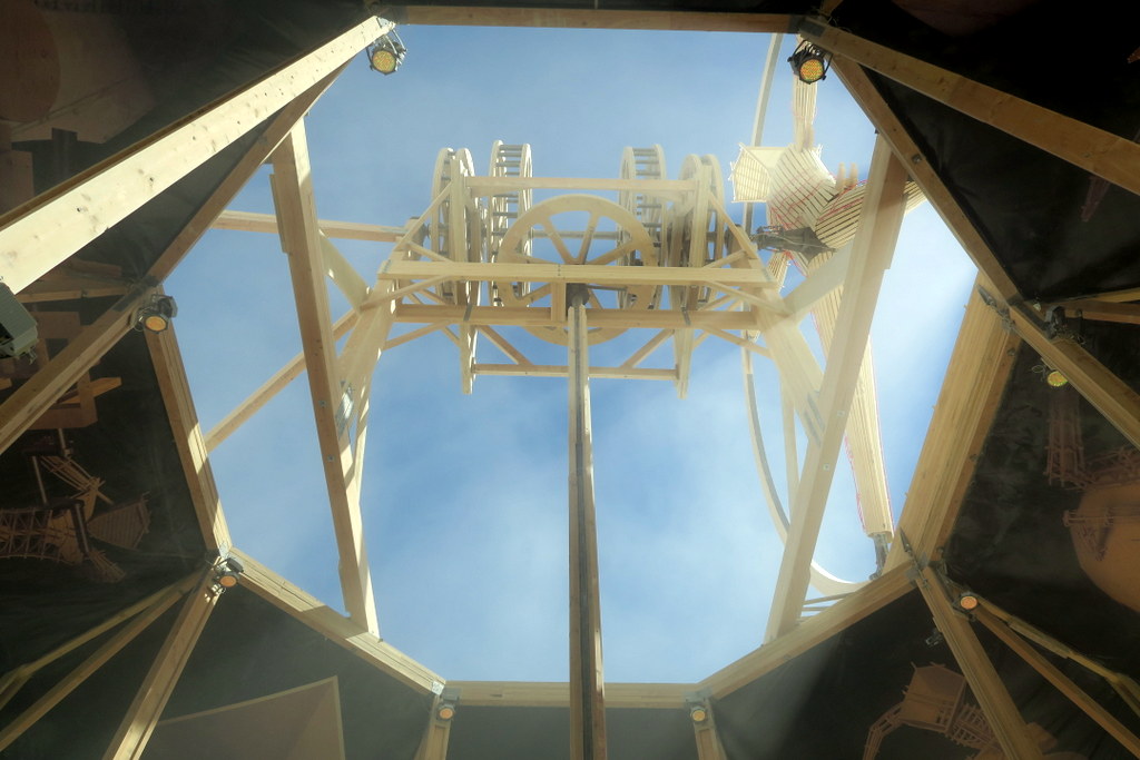 Первая: Вот, собственно сам Мэн, с необычного ракурса снизу. Это здоровая деревянная фигура символизирующая власть и авторитет. В конце недели её сожгут. В прошлом году тема фестиваля была "Мастерская ДаВинчи", так что Мэн был в образе витрувианского человека. По задумке он должен был крутиться, но что-то пошло не так.