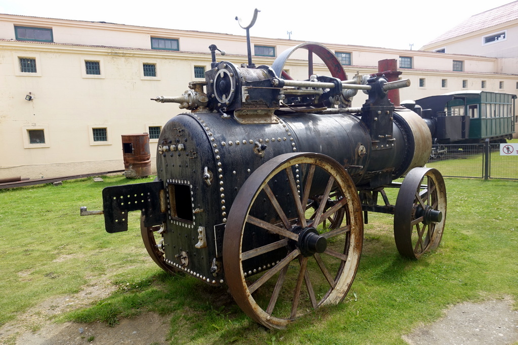 Пока мы были в Ушуайе, на самом краю света, набрели на вот такой очень странный агрегат, который использовался в тех краях в первой части XX века. Сперва я подумал, что это какой-то особенно стимпанковский паровоз, но потом пригляделся, и заметил, что нет характерных перекладин, которые соединяют обычно колёса таких машин.