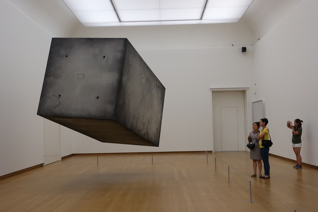 Мы, пока были в Амстердаме, успели не только на гей-парад попасть, но и в музей сходить. И в музее увидели вот такую удивительную инсталляцию: огромный зал, посреди которого в воздухе парит гигантский прямоугольник из бетонных плит. Вот как это выглядело: