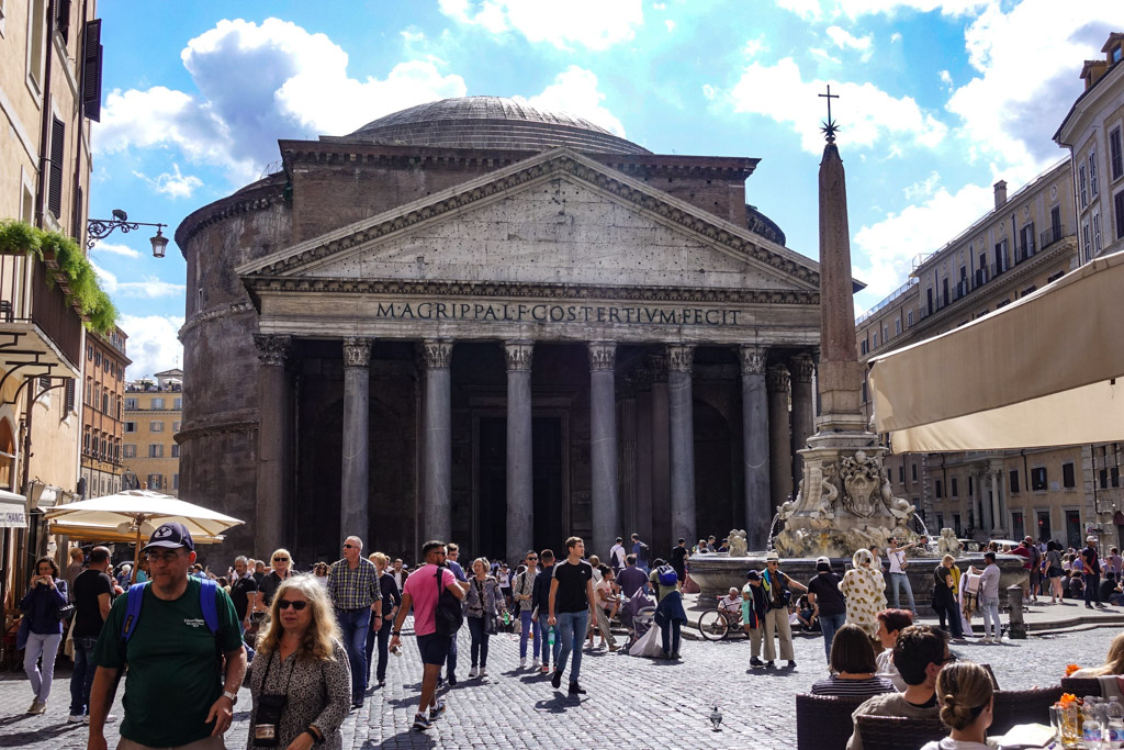 Площадь перед Пантеоном называется Пьяцца-делла-Ротонда, с неё виден античный фасад, на котором красуется надпись на 150 лет старше самого здания: нынешний храм был построен на месте сгоревшего первого, с него и сохранились буквы с именем Марка Випсания Агриппы. Так как сегодня внутри действующая церковь, вход в этот памятник древности бесплатный - надо лишь очередь отстоять...