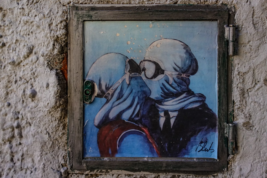 В Италии есть свой собственный Бэнкси - "уличный" художник по кличке Blub. Его (или, её) настоящее имя никому не известно, но вот уже много лет улицы итальянских городов украшают весёлые картинки с вариациями на тему классики мирового искусства. В своём творчестве Blub удивительно последователен: он берёт известные портреты, и перерисовывает их в подводных масках.