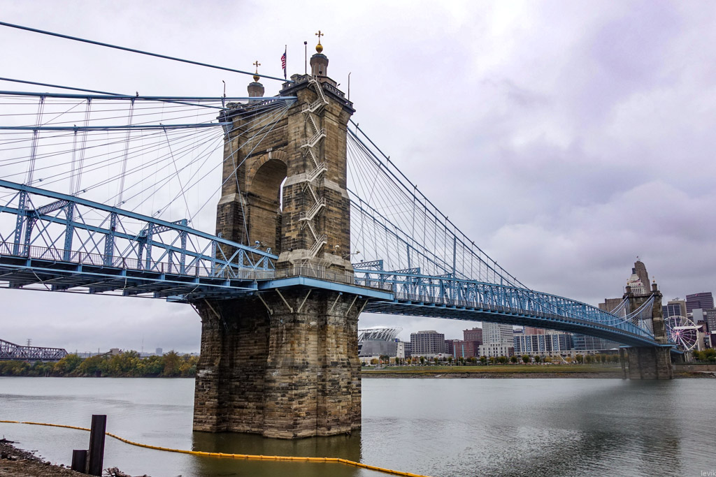 Посмотрите на этот мост... Думаю, большинство из вас никогда его в жизни раньше не видели. Этот мост в американском городе Цинциннати (штат Огайо) не очень знаменит. Полтора века назад, в эпоху своего строительства, он стал длиннейшим в мире. Но сегодня, когда китайцы возводят многокилометровые мосты через море, его 322-метровый пролёт мало кого удивит. Из-за этого, наш мост, который сегодня носит имя своего создателя, Джона Рёблинга, утратил свою былую знаменитость.