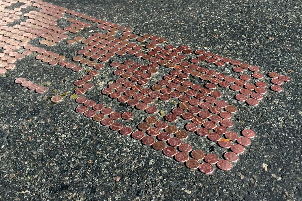 На самом деле это чей-то арт-проект недолеко от моей работы, в районе Челси. Чуваки взяли и одну полоску пешеходной зебры выложили центами. Класс! Люблю такое художество.