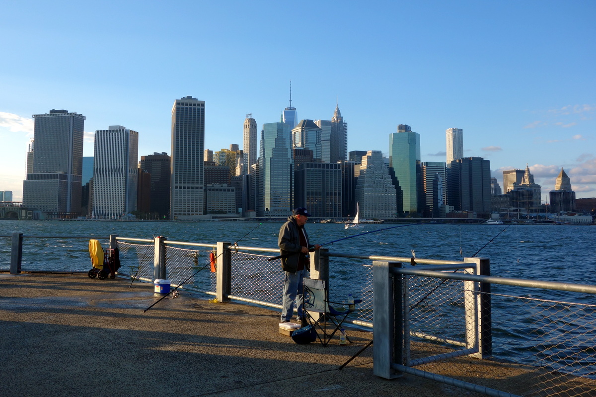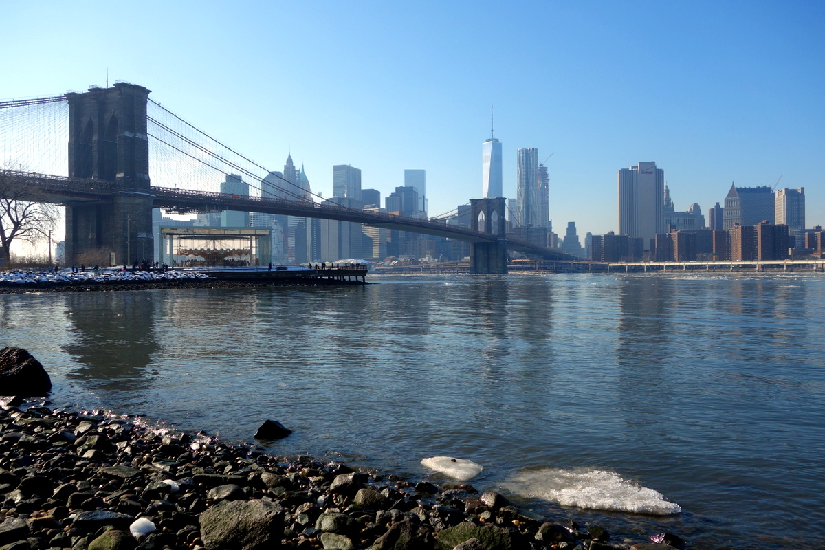 Тут Бруклинский и Манхэттенский мосты находятся очень близко друг к другу, и между ними есть маленький каменистый пляжик. Вот это моё любимое место во всём Нью Йорке. Перед тобой вода, на той стороне небоскрёбы, а с обеих сторон твоё поле зрения обрамляют гигантские мосты, один с каменными башнями, другой - с железными. В один кадр они к сожалению не влезают.