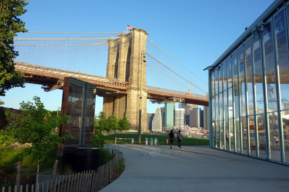 Если пройти вдоль всего променада, и ещё немного по городу, можно спуститься прямо к воде на Fulton Landing. Слева от вас будет новый парк, а справа - Бруклинский мост. Виды с набережной прекрасные.