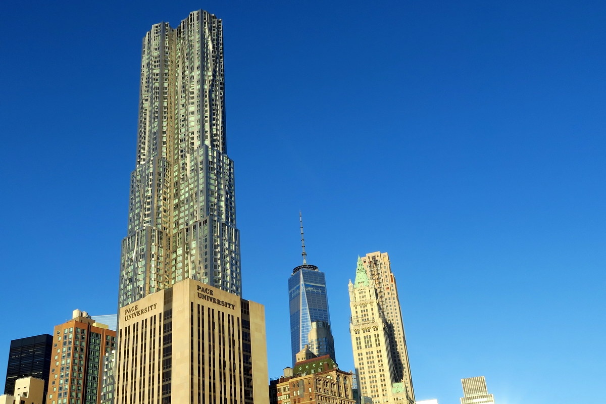 Прямо перед спуском с Бруклинского моста стоит витьеватый небоскрёб Фэнка Гери, который прославился своими "мятыми" фасадами. Здание очень крсивое, только разочаровывает, что сзади оно абсолютно плоское!
