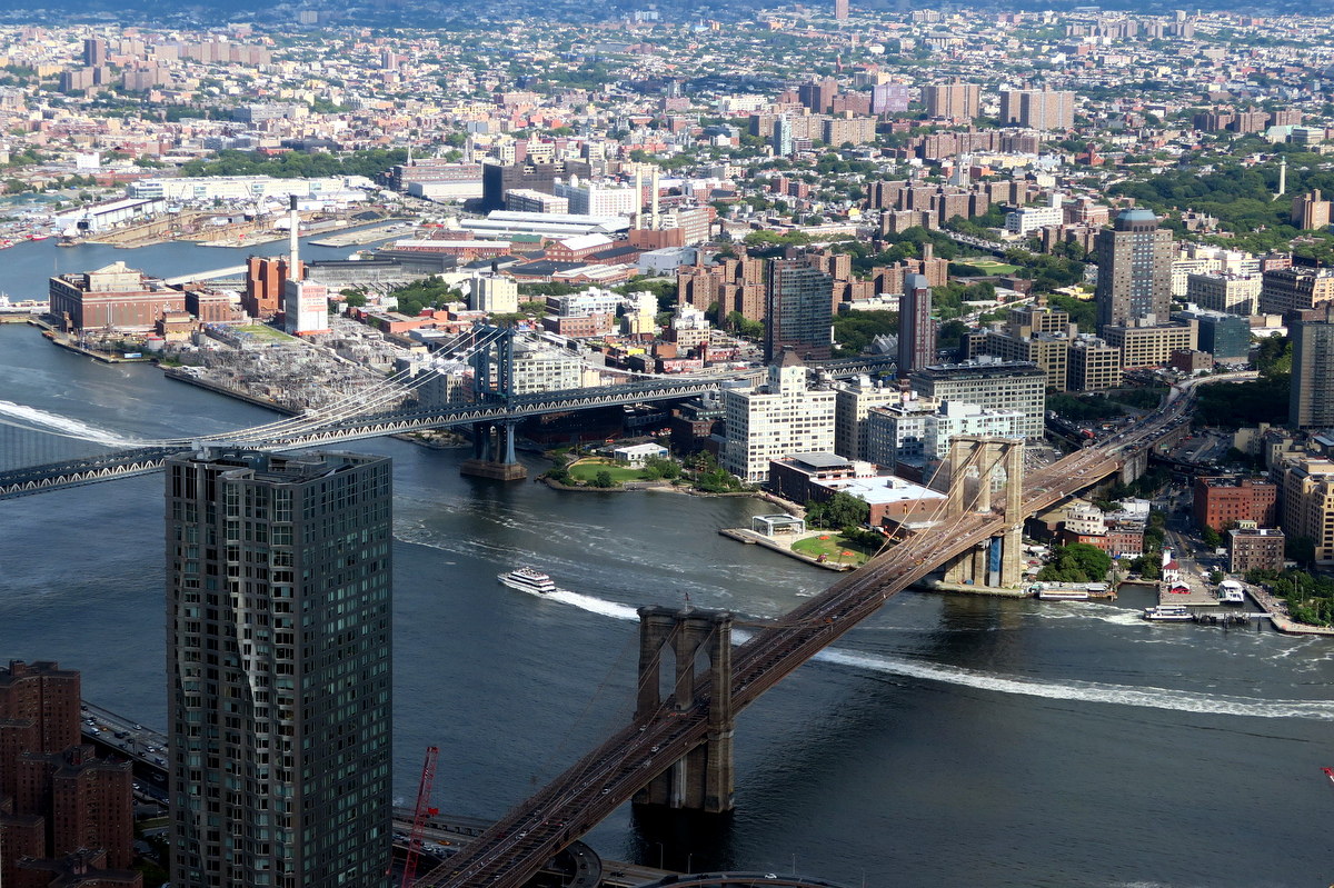 Так как я не могу вам показать на фотографии вид с этого пляжа целиком, покажу как он выглядит со стороны. Вот эут фотографию я сделал с обзерватории на новом Всемирном Торговом Центре. На этой фотке видна карусель между мостами, и зелёные лужайки рядом с ней. Пляжик находится у лужайки ближе к Манхэттенскому мосту.