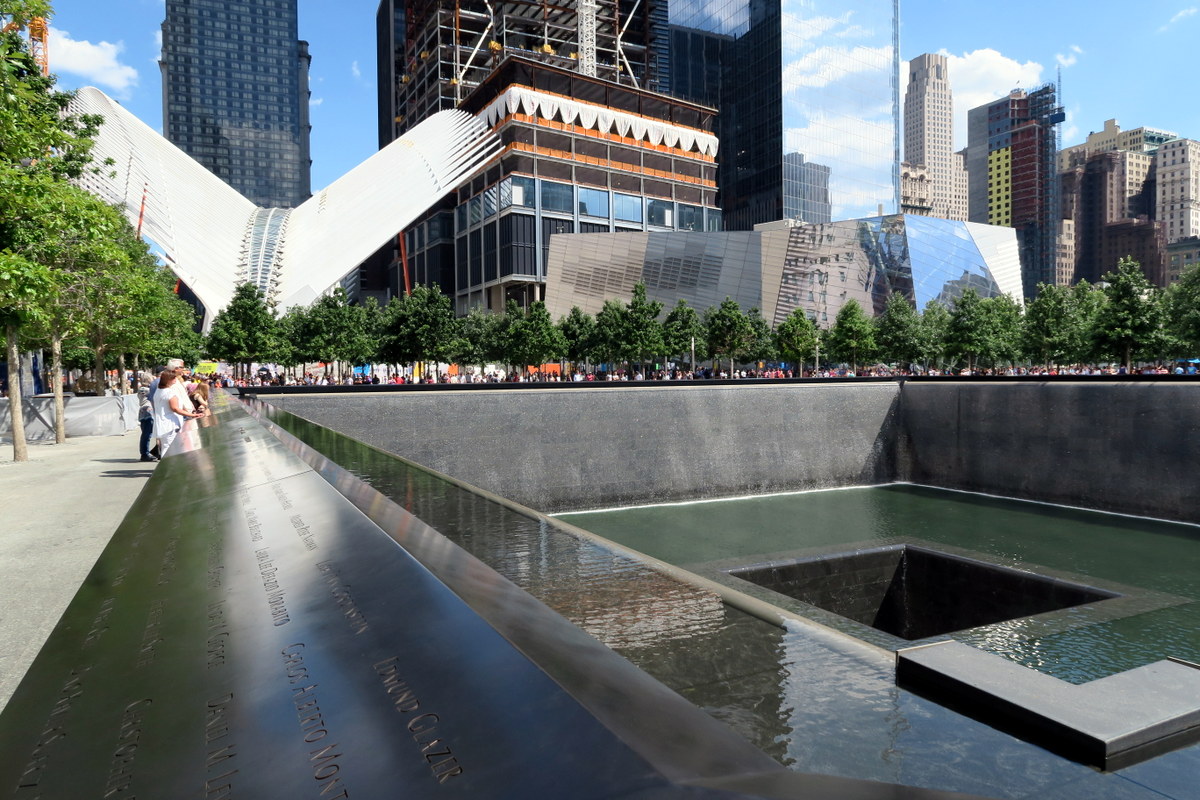 Прямо у подножья новой башни стоит мемориал старым. Это красивое пространство, где на месте бывших близнецов зияют бездонные чёрные дыры, в которые стекает вода.