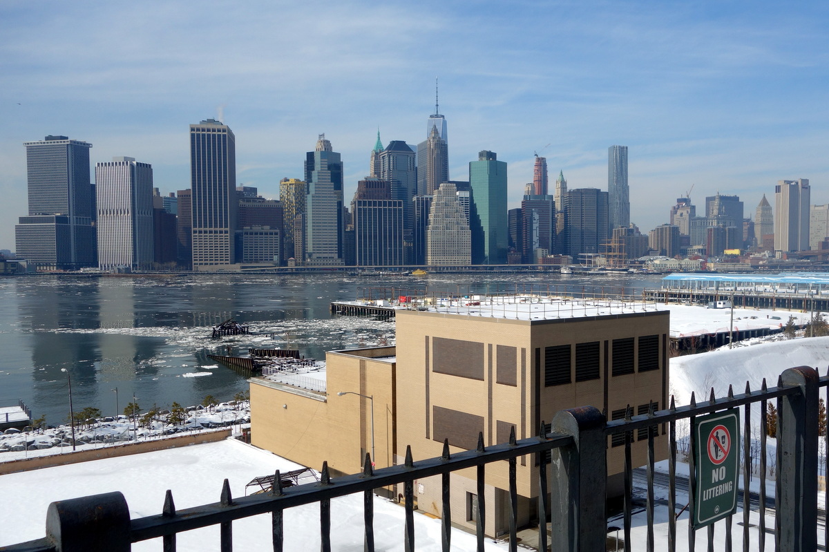 ...вот такого вида. Это променад Brooklyn Heights, смотрит с прибрежного холма на нижний Манхэттен. Перед нами East River, которая зимой как правило не замерзает (не так то у нас и холодно, да и к тому же это на самом деле не река, а залив).