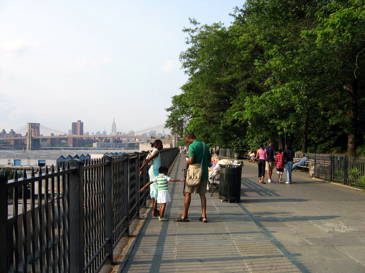 Под променадом идёт двухярусное шоссе (Brooklyn-Queens Expressway), которое отсюда почти не видно. А прямо у воды долгое время была заброшенная зона. Раньше тут был порт, но им перестали пользоваться, и район долго гнил и ржавел. Зато в последние несколько лет, город устроил тут парк, преобразив до неузнаваемости линию берега. Отсюда на этот парк отркывается прекрасный вид.