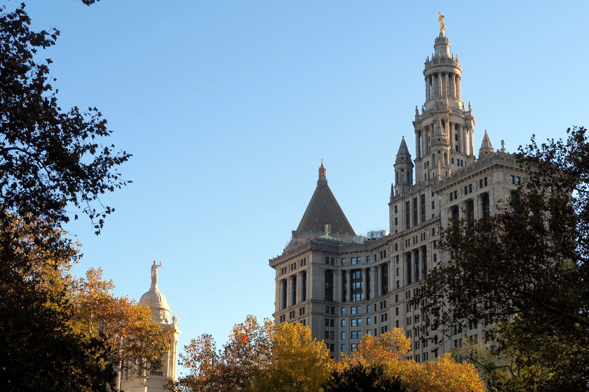 Спустившись попадаем в небольшой парк возле Сити Холла. Здесь сердце старого даунтауна Манхэттена. Вокруг старые небоскрёбы, построенные ещё в те времена, когда на крыши принято было ставить не шпили а римских богов.