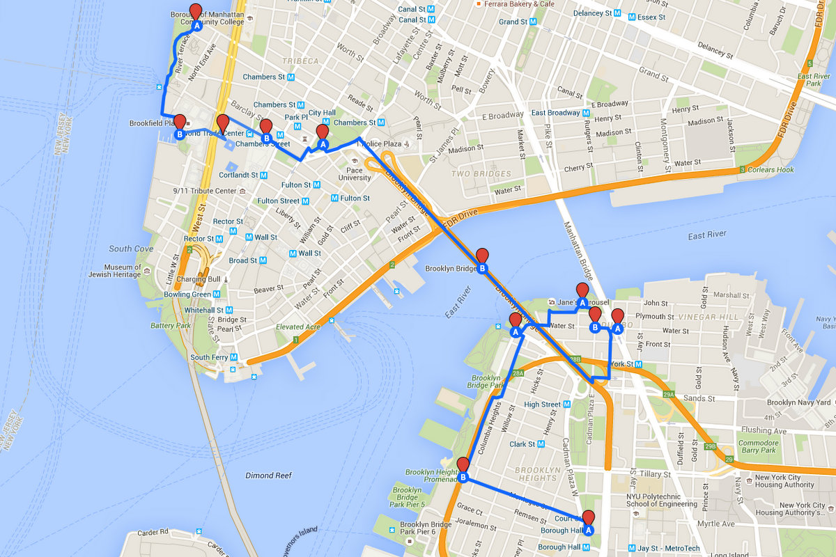 Вот примерный план прогулки. Начнём мы в Бруклине, на станции метро Court St./Borough Hall (это ветки 2, 3, 4, 5 и R). Маршрут может занять от двух часов до шести, в зависимости от количества остановок и перекусов. Оба варианта, и всё посередине, гарантируют интересное и насыщенное времяпровождение.