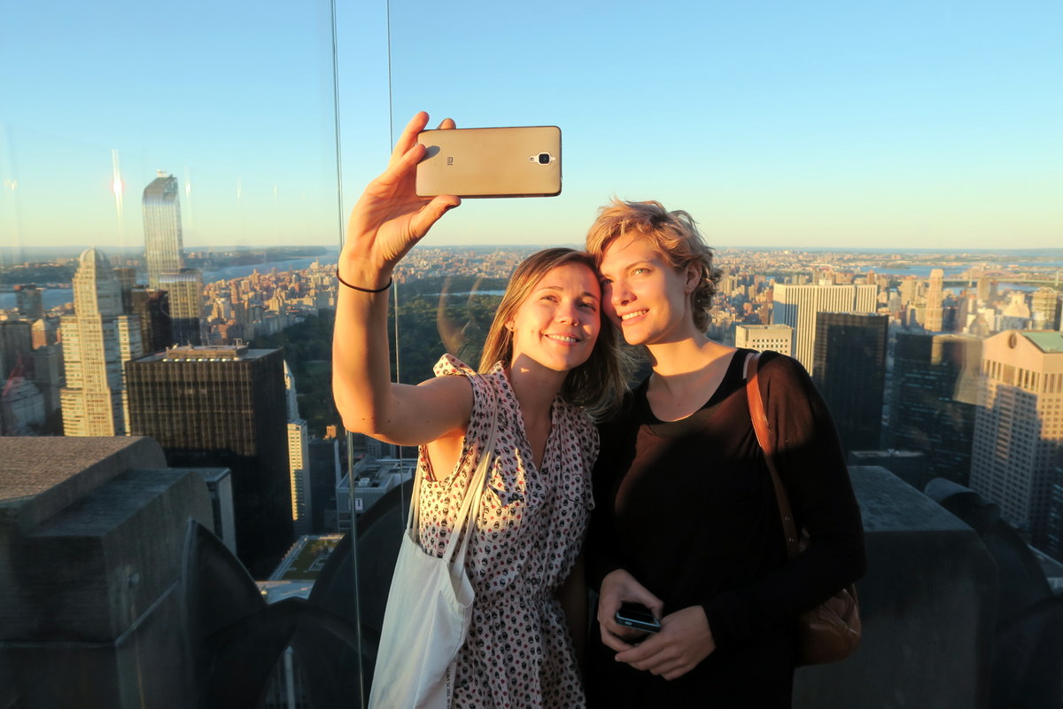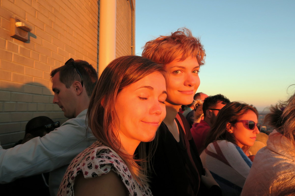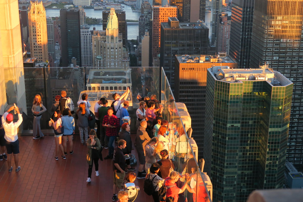 С крыши хорошо виден нижний уровень смотровой площадки. Мы поняли, что скоро будет закат, и решили остаться посмотреть, как солнце садится на той стороне Гудзона.