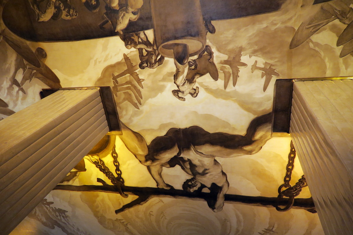 Вот главный вестибюль. Он украшен современными фресками в очень интересном стиле - на потолке изображены титаны, вставшие ногами на вершины колонн в лобби. Вокруг них люди занятые важной и тяжкой работой.