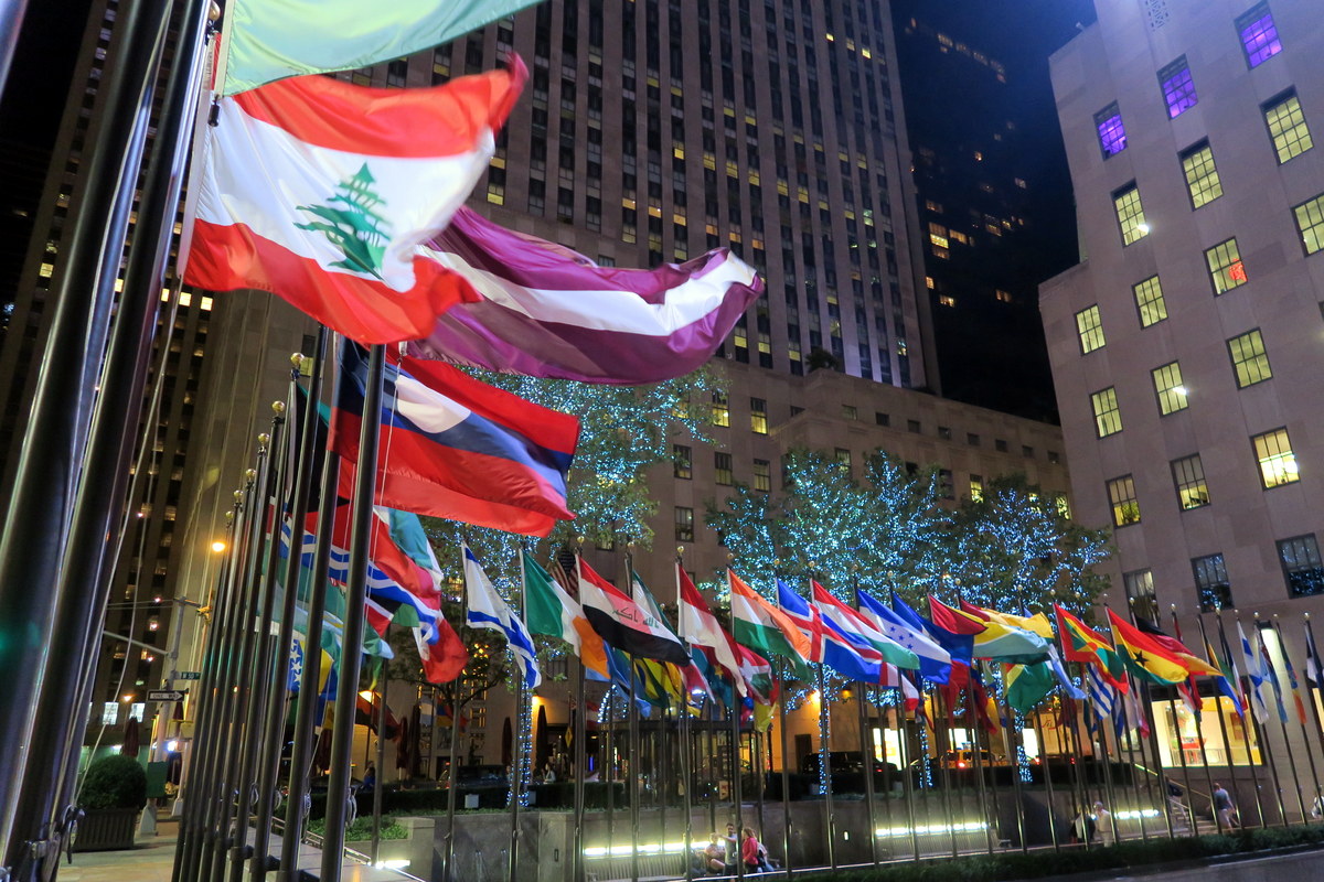 Вход в здание смотрит на Рокфеллер Плазу, здесь много флагов и зимой каток.