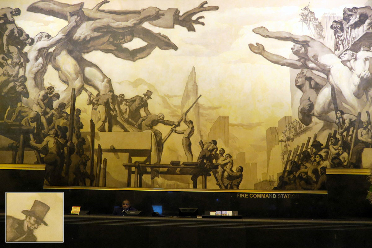 Стиль изображения сильно приближен к соц-реализму. Это не спроста, у украшений этого вестибюля тоже интересная история. Дело в том, что в 1933 году, Рокфеллер пригласил знаменитого мексиканского художника Диего Риверу, чтоб тот создал картину для вестибюля. Ривера, известный социалист, который дружил с Троцким, нарисовал работу под названием "Человек на Распутье" (Man at the Crossroads):