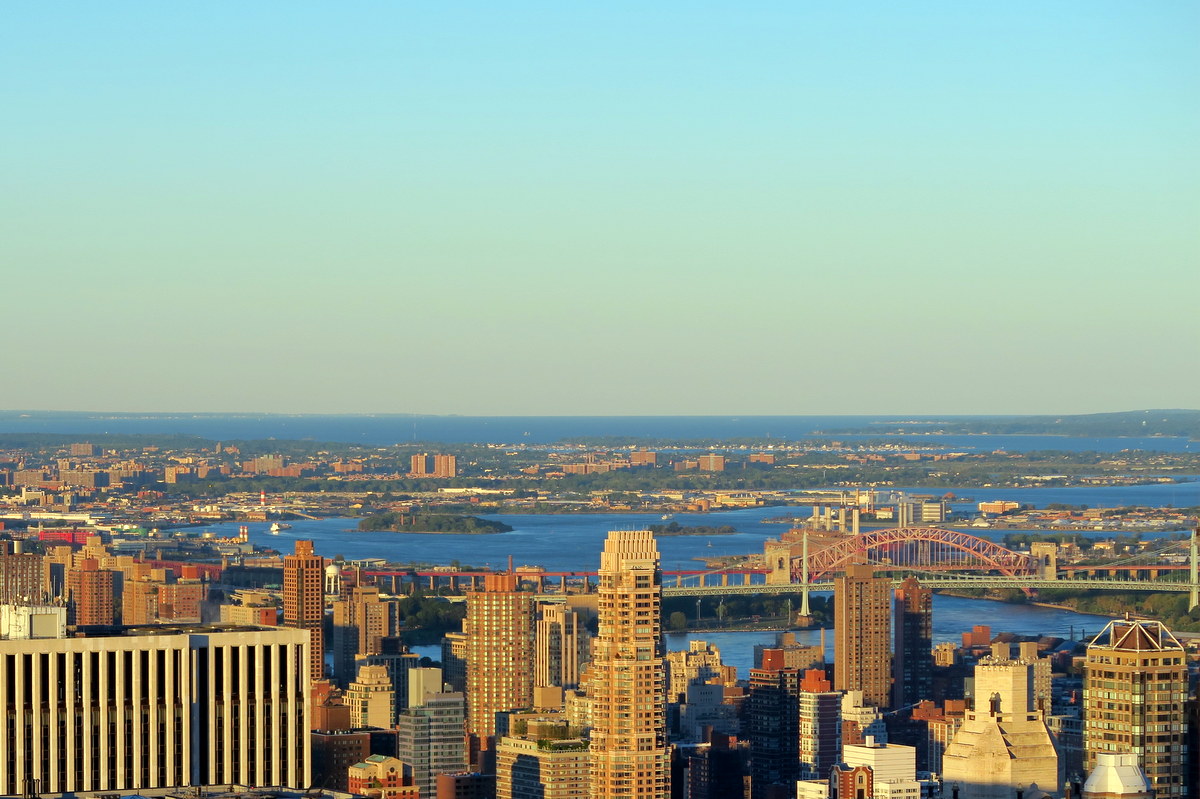 Видно Гудзон до Вашингтонского моста, ведущего в Нью Джерси. Это уже 170-е стриты! Сам Рокфеллер-центр находится на 50-й стрит, то есть тут вид на 120+ кварталов.