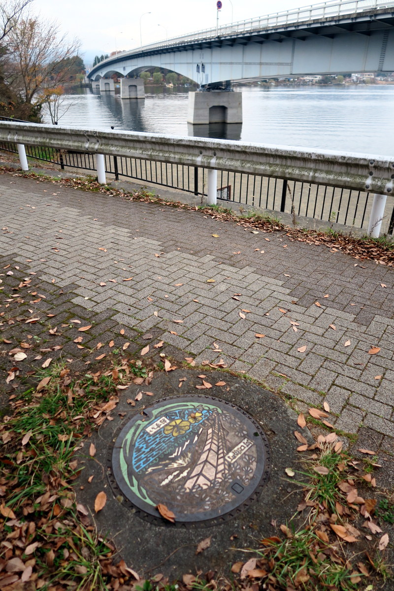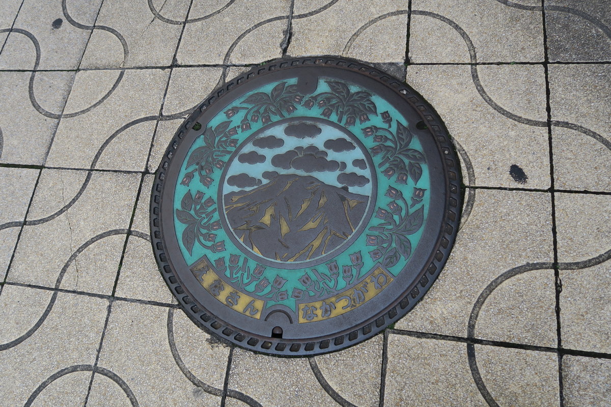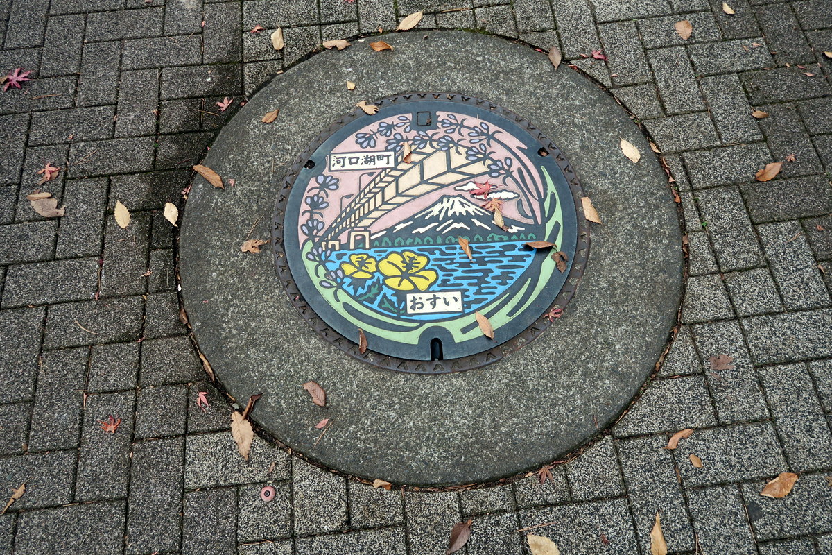 А это в туристическом городке Кавагучико, у подножья горы Фудзи. Тут на люке изображён мост, и сама гора.