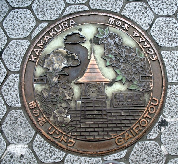 ...насчёт цветных люков - кроме окраски и наклеек или пластиковых вставок, бывает и посложнее техника. Вот люк из Камакуры с изображением ж/д станции Камакура. Кроме эмали, применена техника вставок из медного сплава: