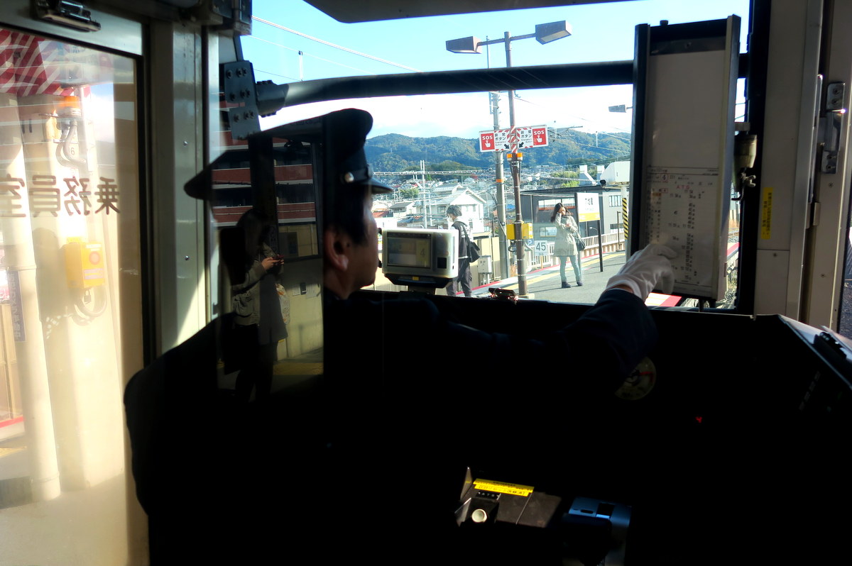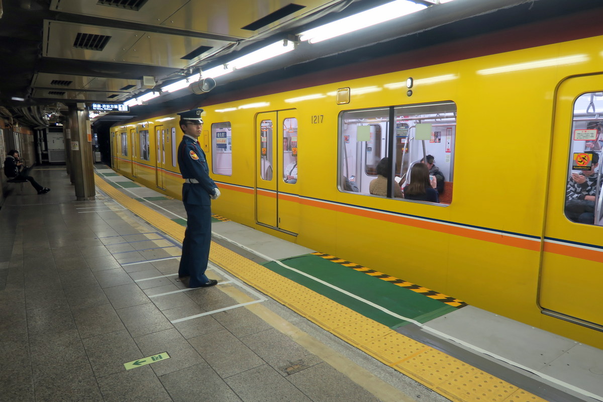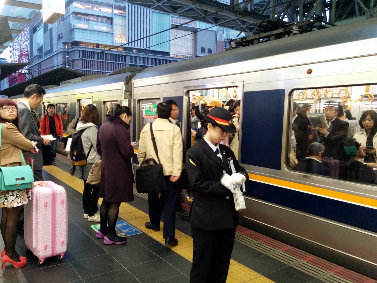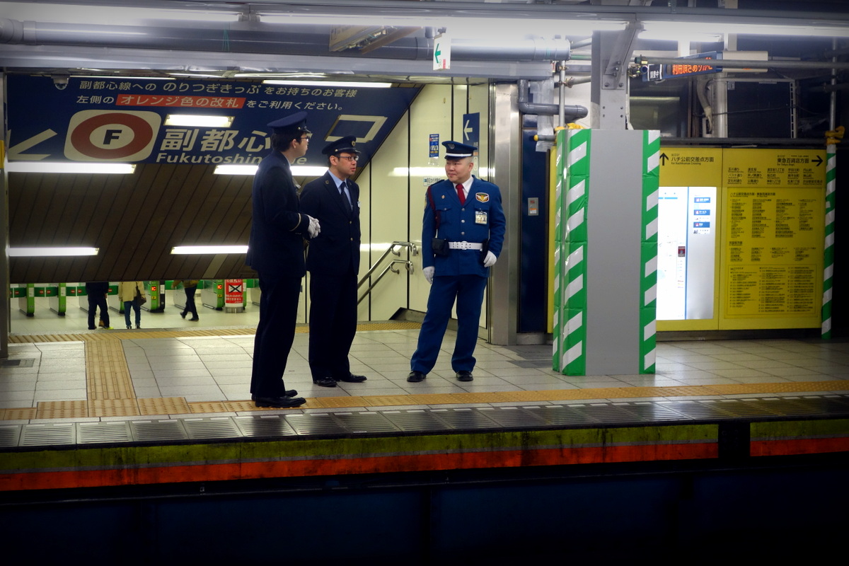Японцы очень любят форменную одежду. Любой японец на мало-мальски официальной должности будет одет в какую-нибудь парадного вида форму. Железнодорожные работники не исключение - они обязательно в кителях, форменных фуражках и белых перчатках. Они дежурят на платформах, следя за порядком.