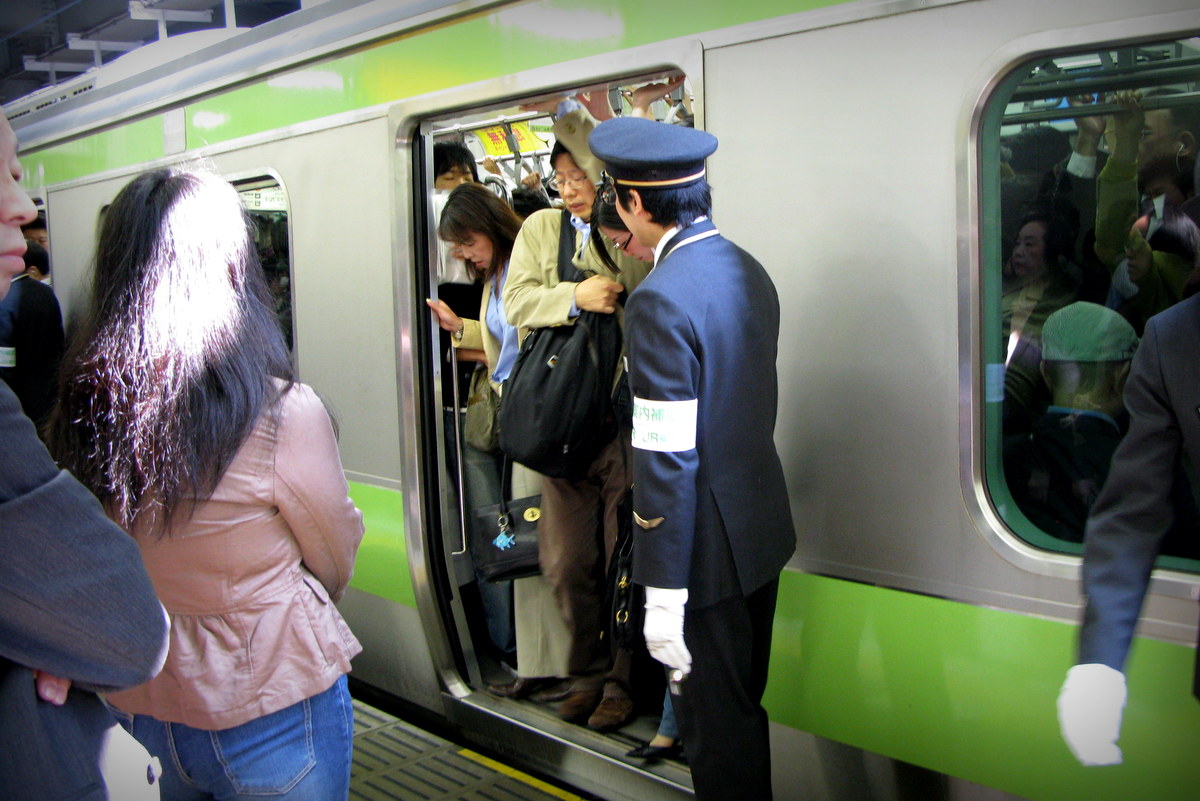 Меня всё время спрашивают, "А ты видел, чтоб полицейские заталкивали народ в поезда?" Во первых, не полиция - просто служащие все в такой форме. Во вторых, почти видел. Не то чтоб прямо заталкивали, но прижимали рюкзак, или пальто, чтоб двери могли закрыться. Но вроде как бывает и действительно заталкивают.