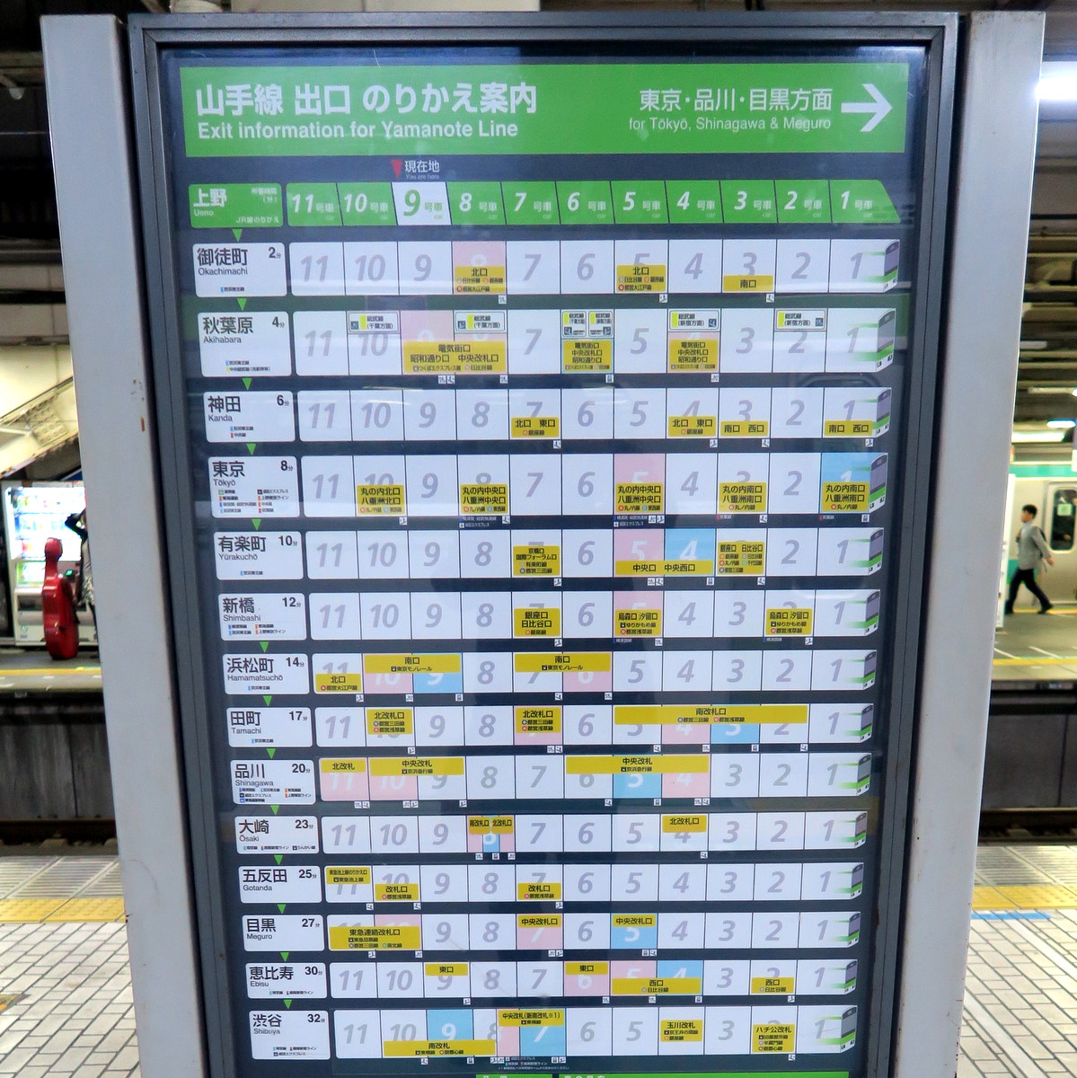 На линии Yamanote стоят вот такие карты, показывающие, в каком вагоне лучше ехать для каждого выхода со всех станций.