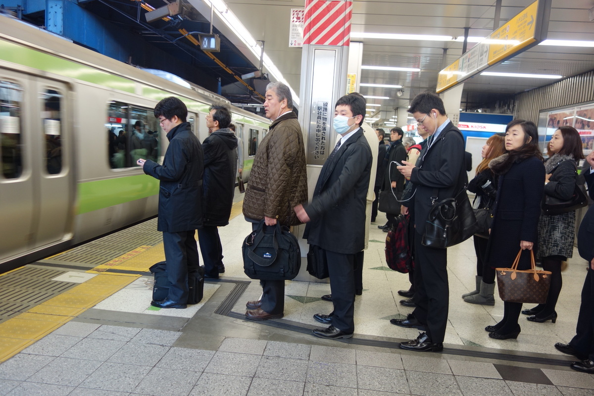 Люди на перроне выстраиваются в аккуратные очереди (на платформе отмечено, куда приедут двери вагонов). Когда приходит поезд, очереди расступаются по бокам, чтоб дать пассажирам выйти. В очереди никто не пытается друг-друга обогнать, все стоят спокойно.