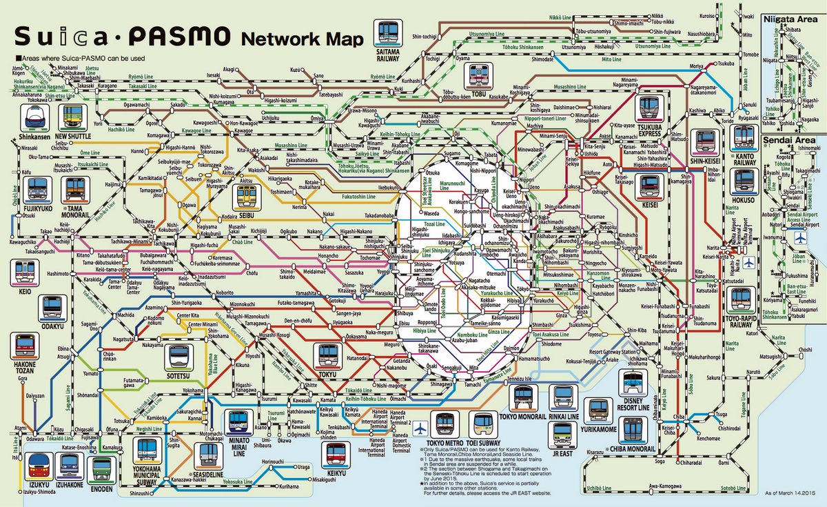 Границы между метро, электричками и поездами у японцев очень размыты. Например в Токио есть метрополитэн (даже два), а есть метро-образные электрички компании JR, которые из местных (типа линии Yamanote) постепенно превращаются в дальноходные. Если помните, я в посте про районы Токио уже показывал эту запутанную сеть: