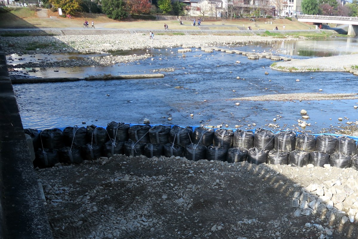 Как и многие городские реки Японии, Камо "одета" в цемент. Её высокие но пологие берега выложили блоками наподобие кирпичей, чтоб предотвратить обвалы во время полноводья. В щелях между ними зеленеет мох и трава, так что результат выглядит натуральней, чем можно было бы предположит.
