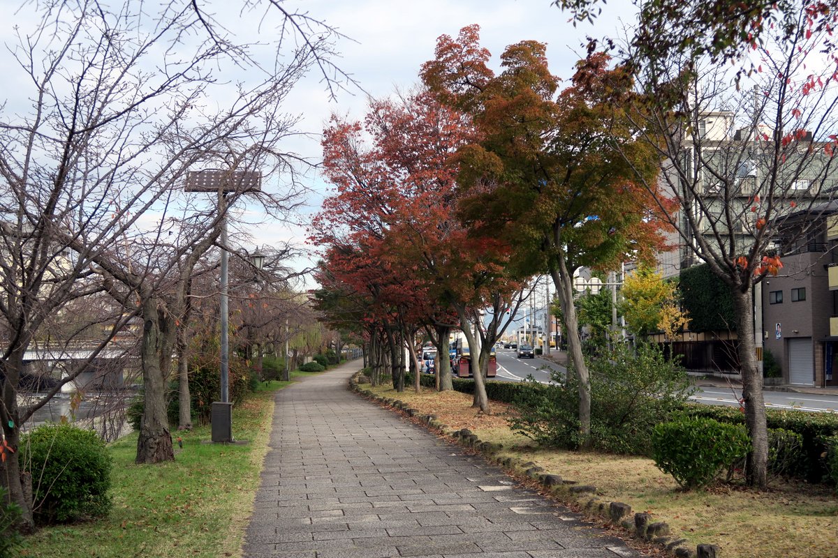 Кстати, насчёт "над мостом", вот как выглядит верхний уровень набережной. Здесь виден секрет сезонного цвета реки - сакура растёт ближе к воде, а клёны дальше. Когда начинаются осенние краски, уже голые ветки сакуры не загораживают красивый осенний цвет клёнов.