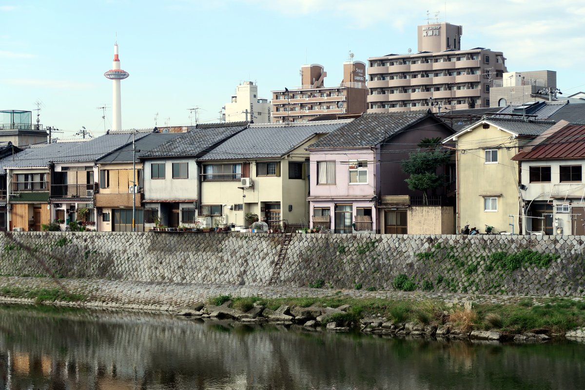 Здесь с берега уже виднеется Башня Киото. У некоторых домиков есть лестницы, чтоб прямо на набережную ходить.