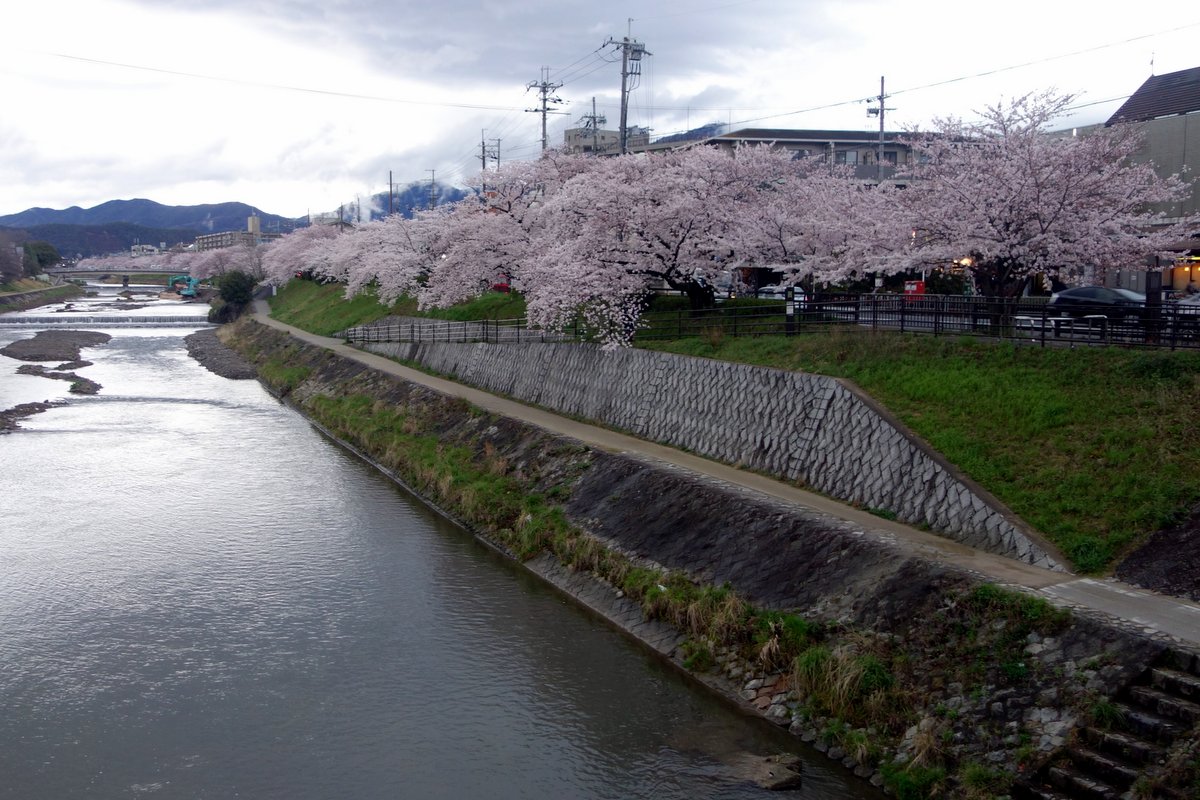 Коса и река идут параллельно пару километров. Здесь одно из самых красивых мест для прокулок - с одной стороны хаотичное нагромождение зданий в старом японском стиле, с другой - набережная, утопающая в цветах текушего сезона.