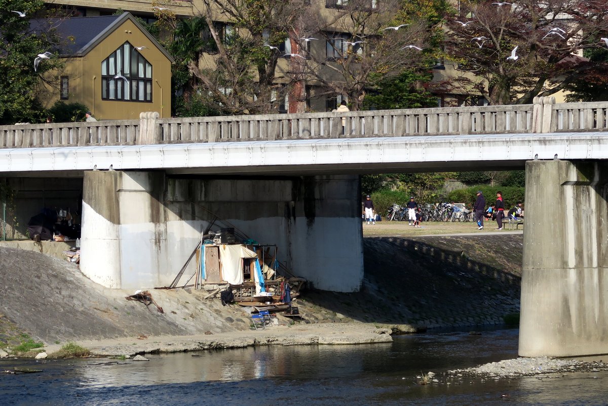 Хотя тут, как и в Токио, некоторые бомжи только ночуют, а некоторые уже капитально обжились, построили себе сарайчики. Над мостом один домик, под мостом - другой.