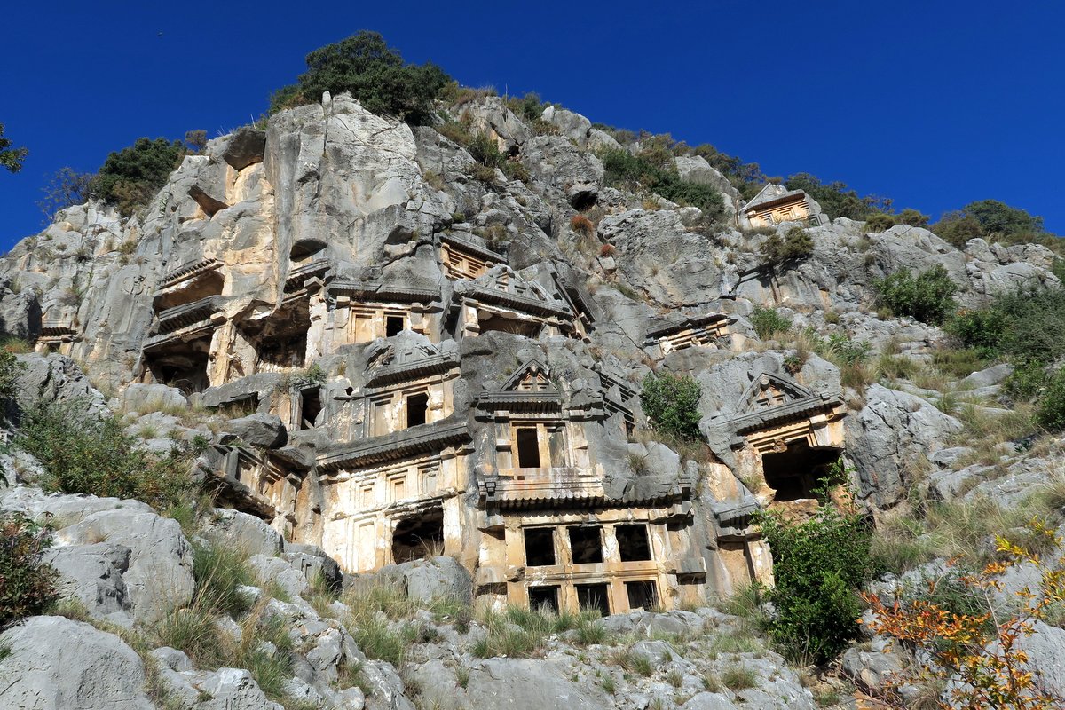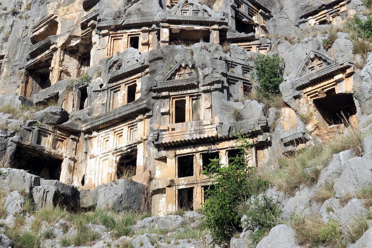 Некрополь невооружённому глазу покажется кучей выдолбленных в скалах "домиков". Он чем-то напомнил мне другой мёртвый город - Петру в Иордании. На самом деле в этих пещерках ликийцы не жили, а хоронили свою знать. С годами престижные захоронения приходилось выдалбливать всё выше и выше!