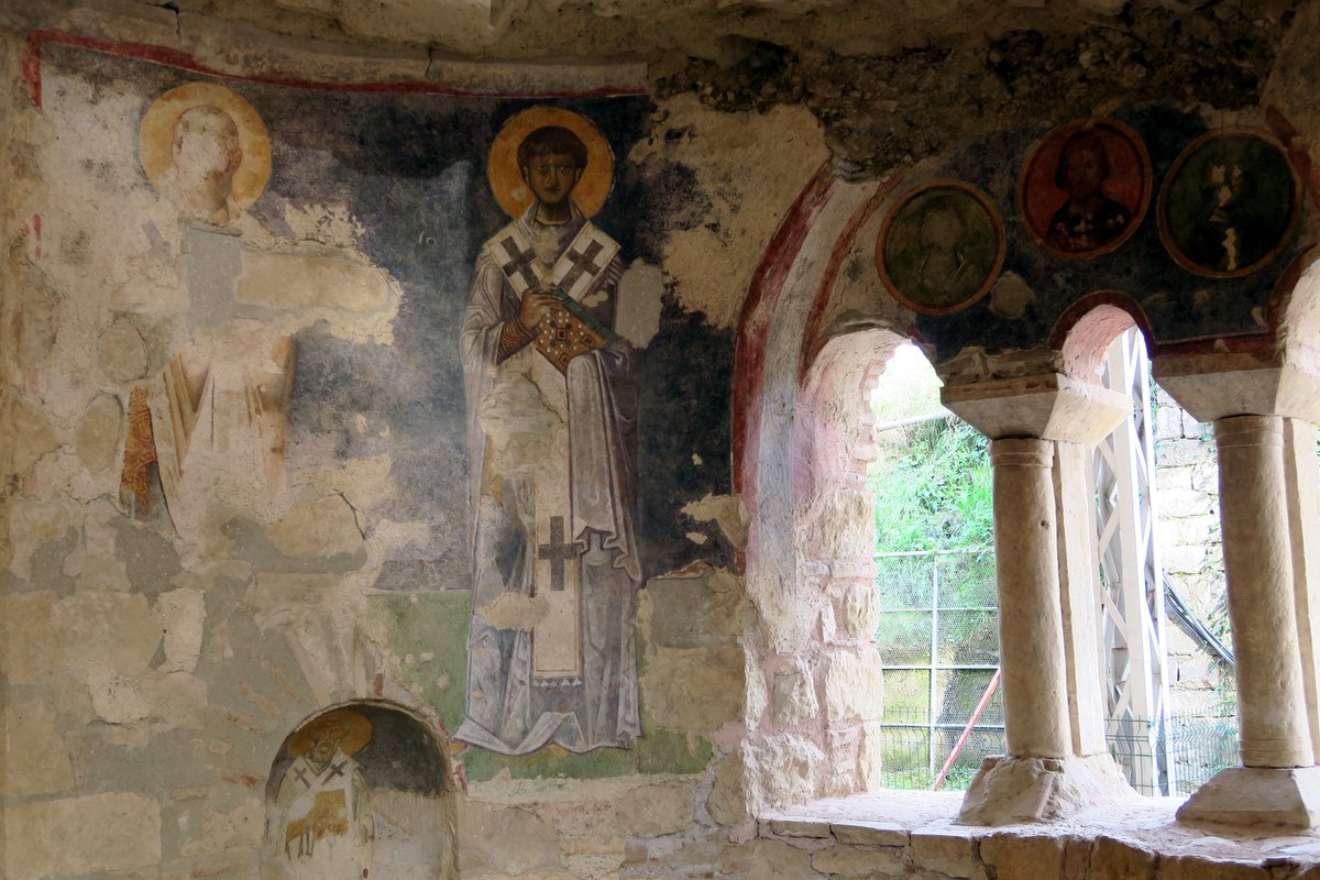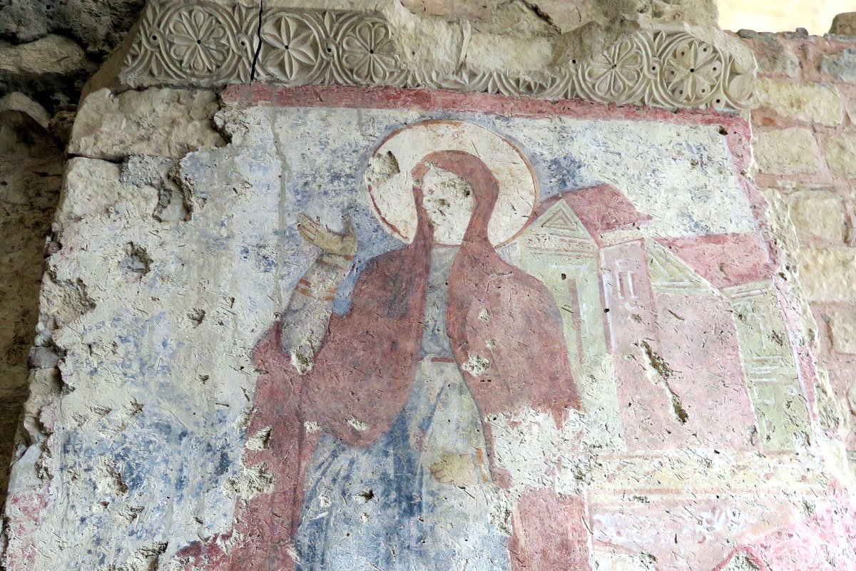 Удивительно, но на стенах сохранились цветные фрески. Единственное что, у многих изображённых героев выцарапаны лица. Я такое уже раньше видел в старых церквях турции. Захватив территорию у христиан, некоторые особо рьяные мусульмане "стирали" запрещённые исламом изображения человека, считая их проявлением идолопоклонства.