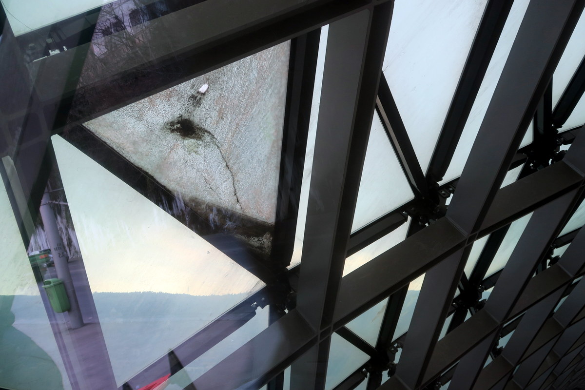 Появляются разбитые панели. Надеюсь это случайно канемь упал, а не хулиганы натворили. Обидно, что такое необычное здание приходит в упадок. Ещё несколько лет, и с ним вряд ли уже можно будет что-то сделать.