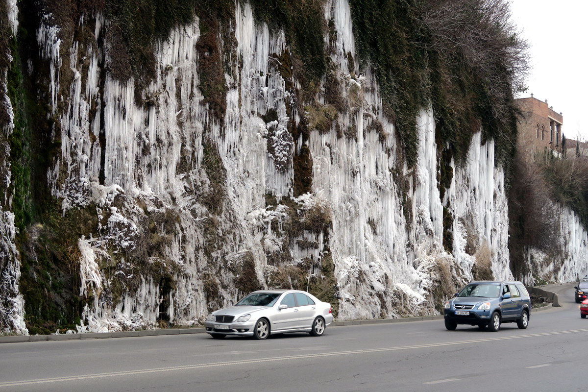 Вдоль Куры много высоких обрывов, город поднимается на крутые берега ступенчато. Зимой в таких местах появляются гигансткие леса из сосулек. Вернее сосуль. Очень красиво, но наверное это небезопасно.