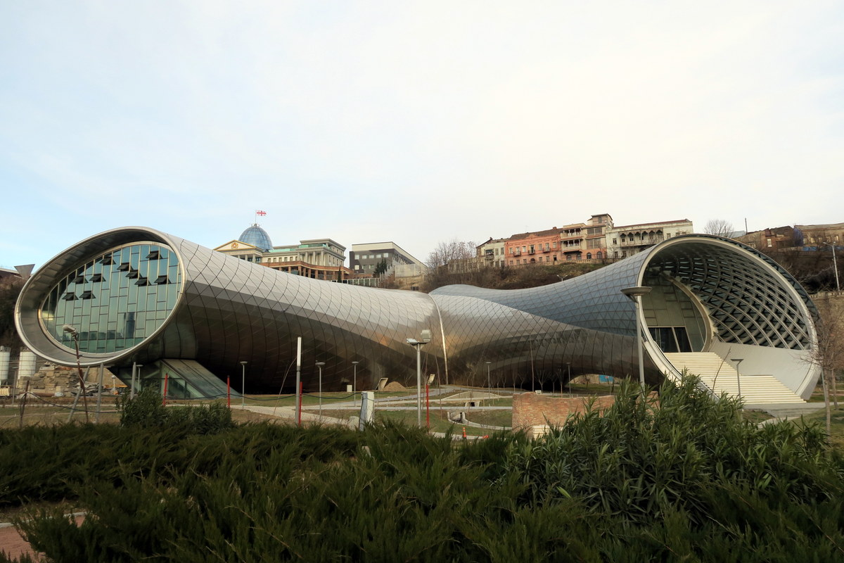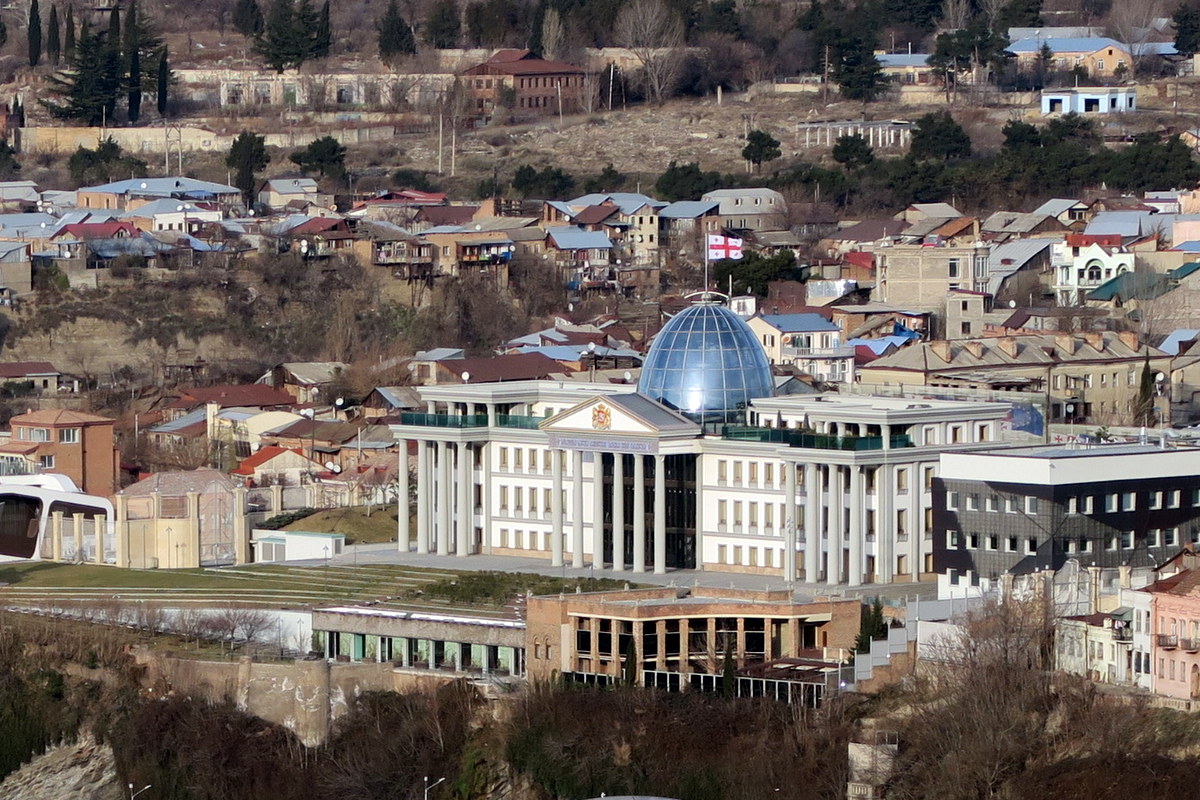 Как в любом старом европейском городе, в середине Тбилиси течёт река, называется Кура. В годы правления Саакашвили (2004 - 2013) вдоль неё построили много современных объектов, которые изменили облик города. Вообще, в Тбилиси складывается ощущение, что всё делится на две части - то что успели доделать при нём, и то, что не успели, и теперь уже непонятно когда доделают... Например вот - Дворец Президента Грузии. Здание закончено в 2009 году, строил его итальянский архитектор Микеле Де Лукки. Стеклянный дворец в классическом стиле возвышается над левым берегом Куры, и ярко подсвечивается ночью. Многие критиковали "Мишу", что он это роскошное здание построил самому себе.