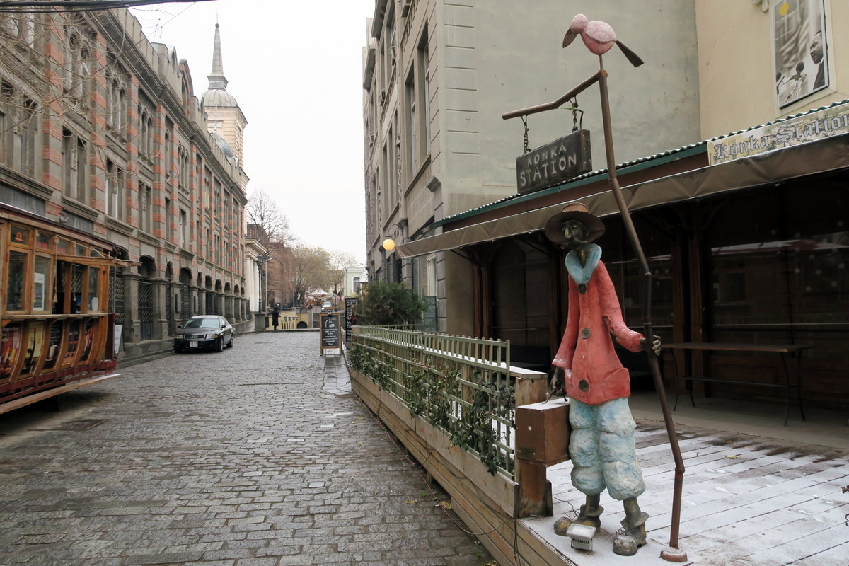 В той части старого города, где Миша успел всё починить, много разных приколов для туристов соорудили. Вот например скульптура человека на станции старой конки. Фигура сделана в чисто грузинском стиле: человек комично высокий, худой, носатый и с усами.