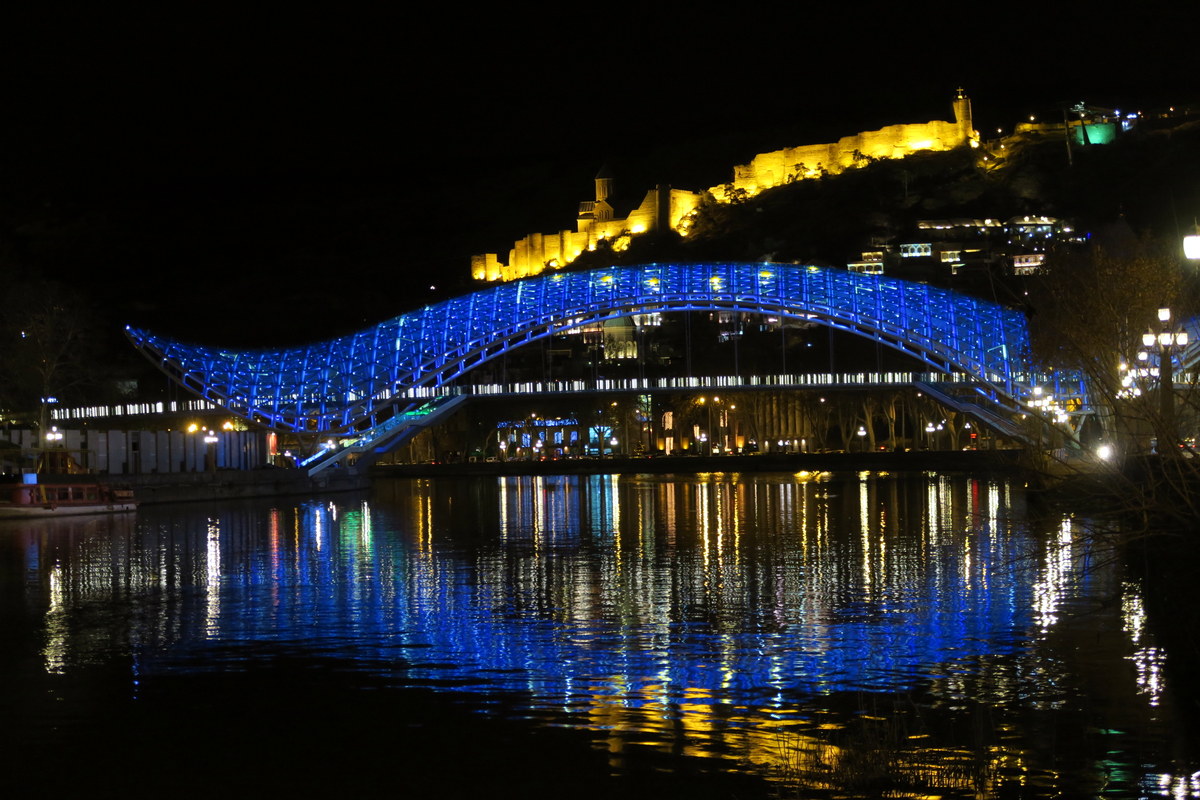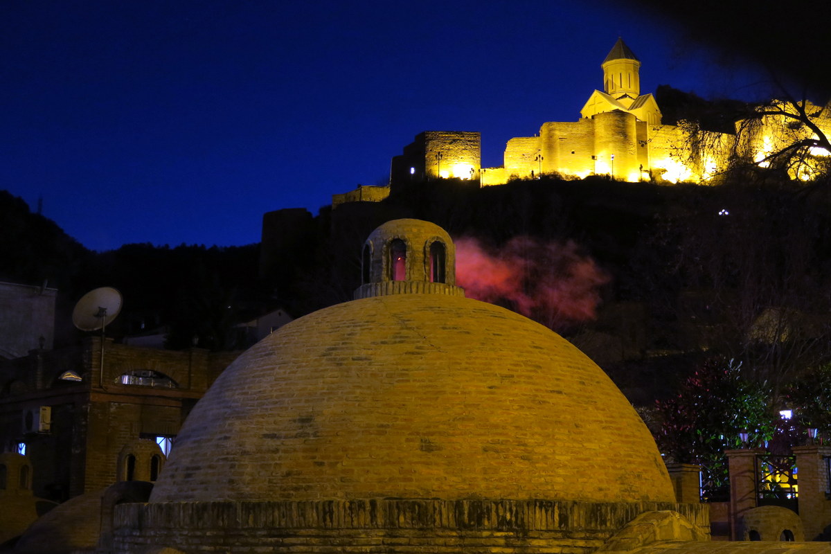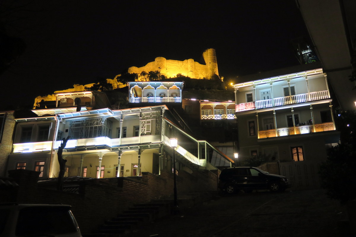 Ночью всё красиво освещают. Слышал, что после ухода Саакашвили (освещение установили при нём разумеется), новые власти решили не тратить на подсветку электричества. Но народу эта идея не понравилась - все привыкли к новому, красивому виду ночного Тбилиси, и подсветку скоро вернули.