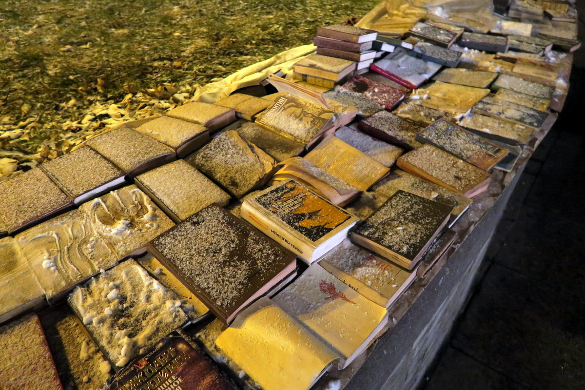 А вот кто-то решил не убирать на ночь свою распродажу прочитанных книг, а тут ночью снег пошёл.